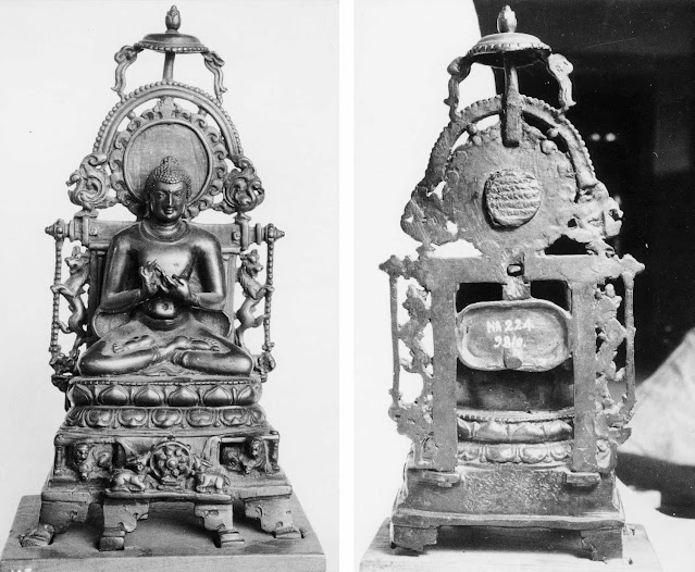 (A)கொடை: அமர்ந்த நிலையில் உள்ள புத்தர் சிலை, நிலத்தை தொடும் முத்திரை - உயரம் : ஐந்தரை அங்குலம் (5 1/2") - அகலம் மூன்றே கால் அங்குலம் ( 3 1/4 ") - தொல்பொருள் பதிவு எண் : 9775 - - நூற்றாண்டு: ஒன்பதாம் நூற்றாண்டு - நூல் குறிப்பு : S.No 11 பக்கம்128